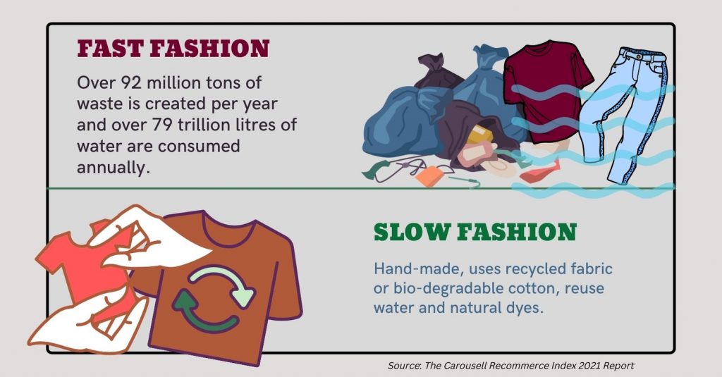 Fast fashion’s negative repercussions include the use of inexpensive and harmful textile dyes, thus making the fashion industry as one of the world’s largest pollutants of clean water. According to Carousell Recommerce Index 2021, over 79 trillion litres of water are consumed annually to sustain the production of cotton and other textiles, and over 92 million tons of waste is created per year.